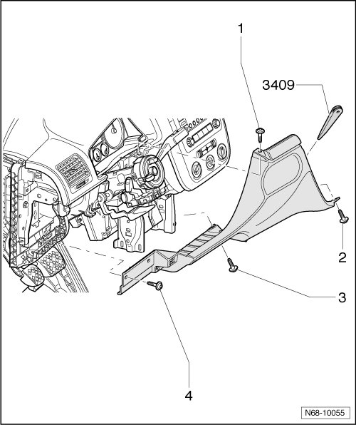 - Remove the trim in the center of the instrument panel (Golf from MY 09). Refer to => [ Trim, Instrument Panel, Center, Golf from MY 09 ] Trim, Instrument Panel, Center, Golf From MY 09