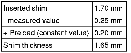 The specified bearing preload is reached when determined measured value (0.25 mm) is subtracted from inserted adjustment shim (1.70 mm).