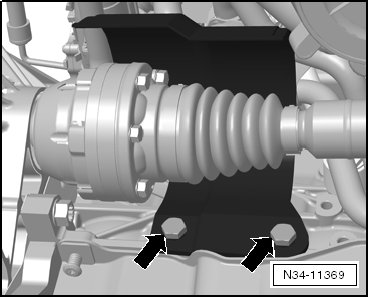 The left drive axle bolt - arrow - must be removed later in the procedure.