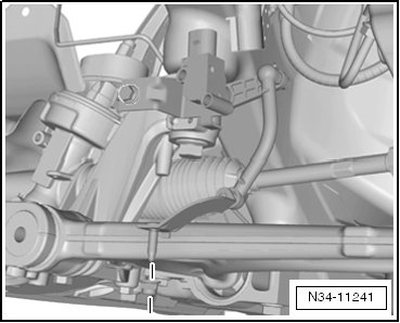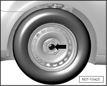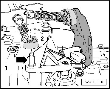 - With the vehicle still sitting on its wheels, loosen the left front drive axle bolt - arrow - a maximum of 90°. Otherwise the wheel bearing will get damaged.