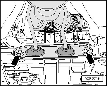 - Remove the exhaust system suspended mount bolts - arrows - from the subframe.