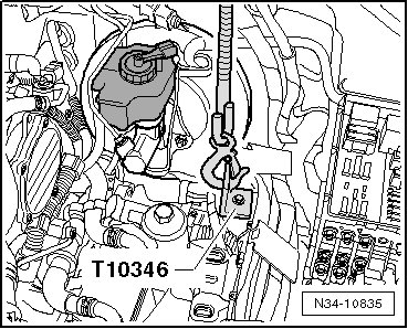 - Then, attach the bracket (T10346) to the engine support bridge spindle.