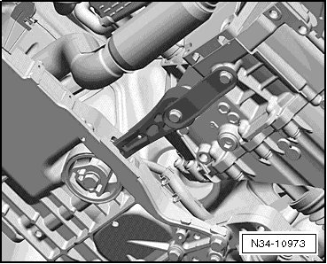 - Move the transmission in the area of the differential with the spindles on the transmission support (3282) into an angled position.
