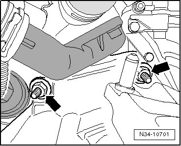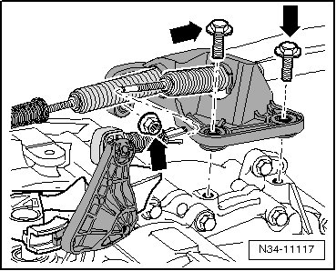 - Remove the cable bracket bolts/nut - arrows - from the transmission, move it to the side and secure it.