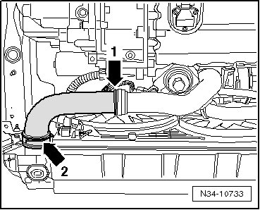 - Release the clamps - arrows 1 and 2 - and remove the charge air hose.