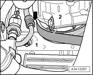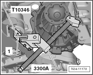 - Install the bracket (T10346) with the bolt - 1 - in the left threaded hole in the subframe.