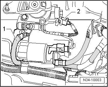 - Remove the ground strap - 1 - from the top starter bolt.