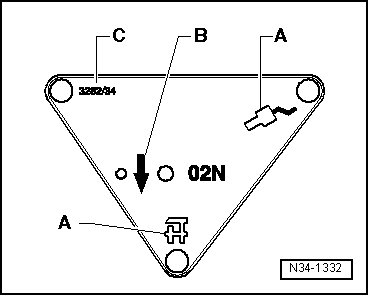 - Position the engine-/gearbox jack (V.A.G 1383 A) under the vehicle. The arrow symbol - B - on the adjustment plate points in the direction of travel.