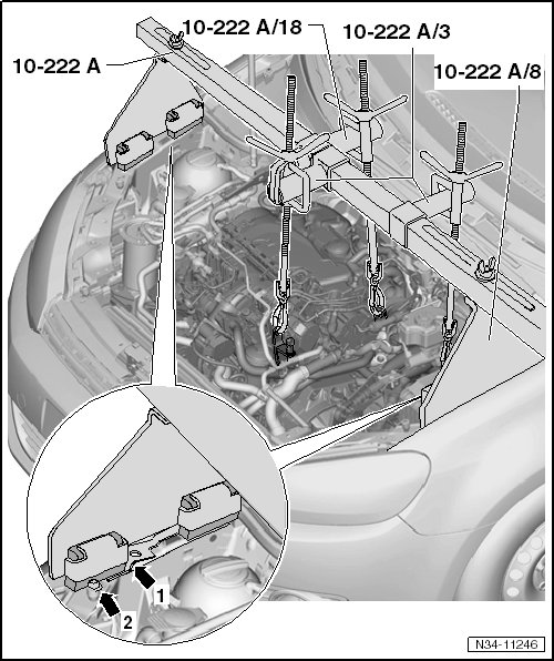 - Install the engine support bridge (10-222 A) in front of the engine hood support.