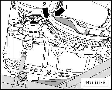 The right flange shaft must be guided past the flywheel - arrow 2 -; pay attention to the intermediate plate - arrow 1 -.