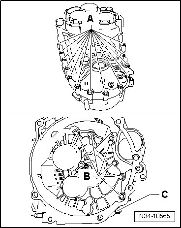 - Install the transmission housing and tighten the bolts - A, B and C - to specification.