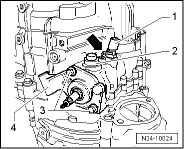 - Hold the output shaft for 1st through 4th gear - 3 - and the selector shafts - 4 - with the right hand.