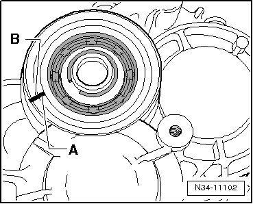 The flattened sides - A - on the grooved ball bearing and on the bearing mount - B - must align in the transmission housing.