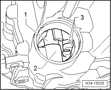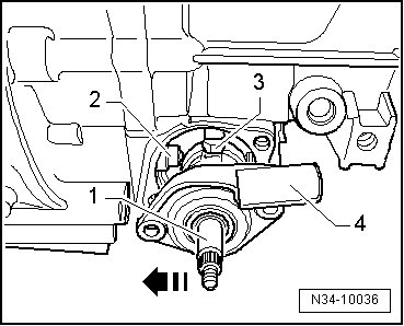 - Push the gear shift shaft - 1 - against the retaining sleeve - 2 - in the - direction of the arrow - and guide is through the selector fork all the way down using the shift finger - 3 -.