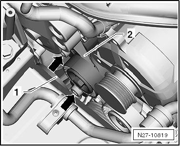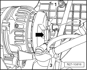 - Remove the 3 bolts - arrows - and then remove the upper idler roller - 1 - from the auxiliary component bracket.