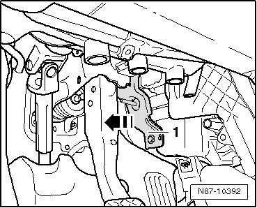 - Push the mount - 1 - in the direction of the brake pedal - arrow - and secure it there with binding components (such as with cable ties).