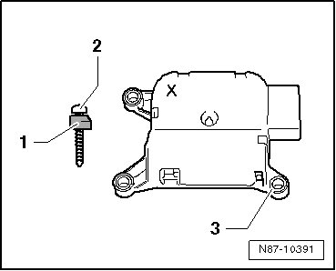 - Attach the new left temperature door motor that is marked with an "X" to the mount - 3 - using the shortened raised head screw - 2 - and the removed mount - 1 -.