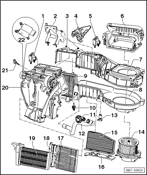 • Removing and installing, refer to => [ Evaporator Temperature Sensor (G308) or Evaporator Vent Temperature Sensor (G263) ] Service and Repair.
