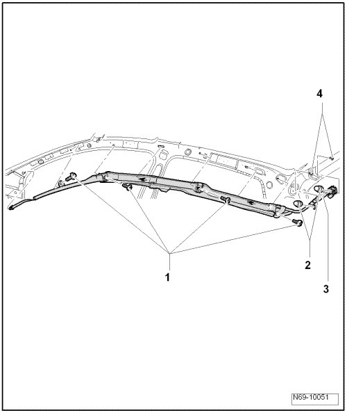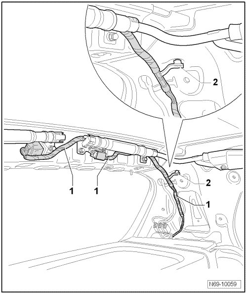 - The wiring harness - 1 - must be attached to the cable guide - 2 - near the C-pillar.