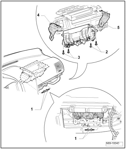 • If the passenger airbag housing is made of plastic, then use locking compound D 197 300 A2 to install the bolts - 2 - and - 3 - (9 Nm).