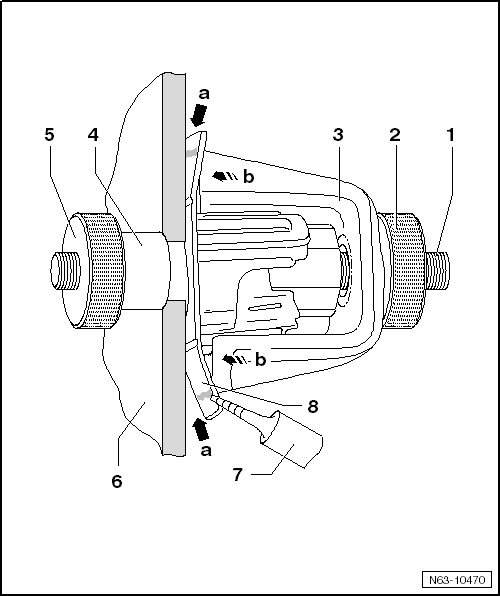 - Position the stamping holes with the bolt head - 1 -, washer - 2 - and counterholder- 3 - on the inside of the bumper cover - 5 -.