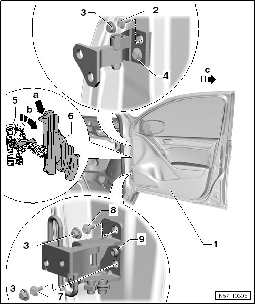 - Pull the door - 1 - off the guide screws - 4 and 9 - in - direction of arrow c -
