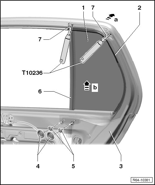 - Remove the door window - 1 - and the bar - 6 - - arrow b - from the door - 3 -.