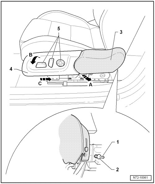 - Remove front trim from seat and disconnect wiring harnesses from switches - 5 -.