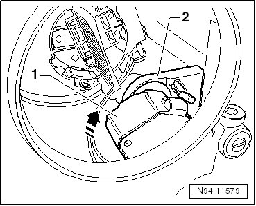 - Turn the headlamp range control positioning motor - 1 - in - direction of arrow - all the way until it stops and then pull it out of the mount - 2 -.