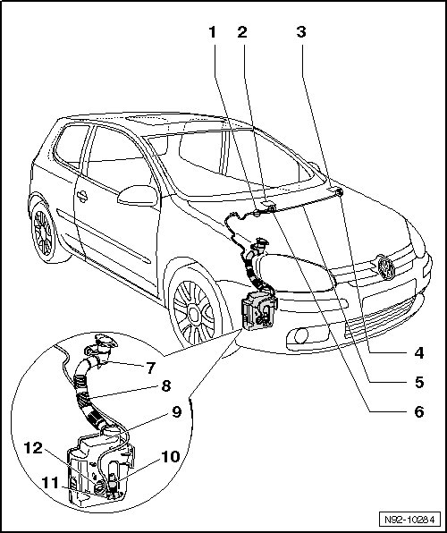 • Removing and installing (GTI), refer to => [ Windshield and Headlamp Washer Fluid Reservoir, GTI ] Windshield and Headlamp Washer Fluid Reservoir, GTI.