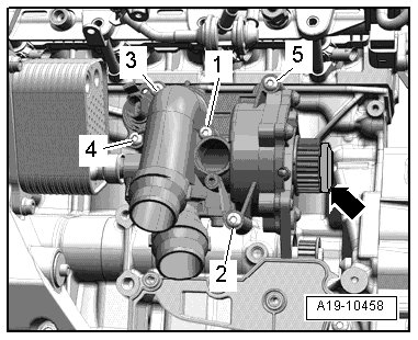 If a new coolant pump was installed, then the protective cap - arrow - must be removed