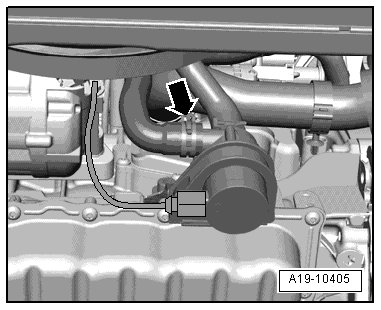 - Remove the lower coolant hose from the after-run coolant pump - arrow - and allow the coolant to drain.