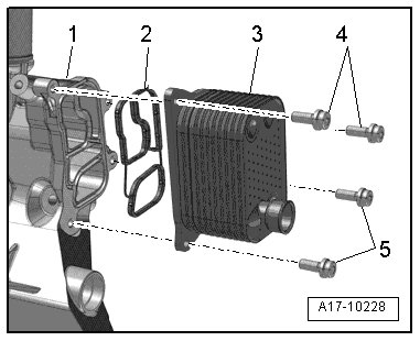 - Remove the bolts - 4 and 5 - and remove the engine oil cooler - 3 - together with the gasket - 2 -.