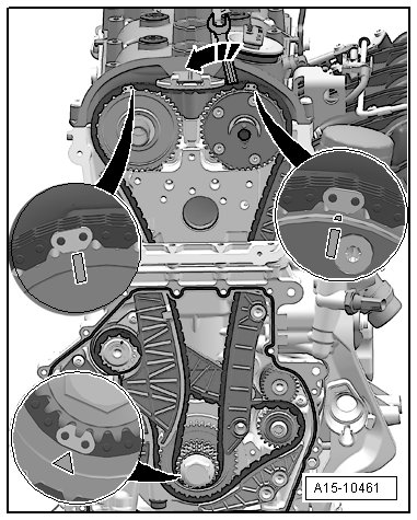 • The notch on the vibration damper must line up with the arrow mark - arrow - on the lower timing chain cover.