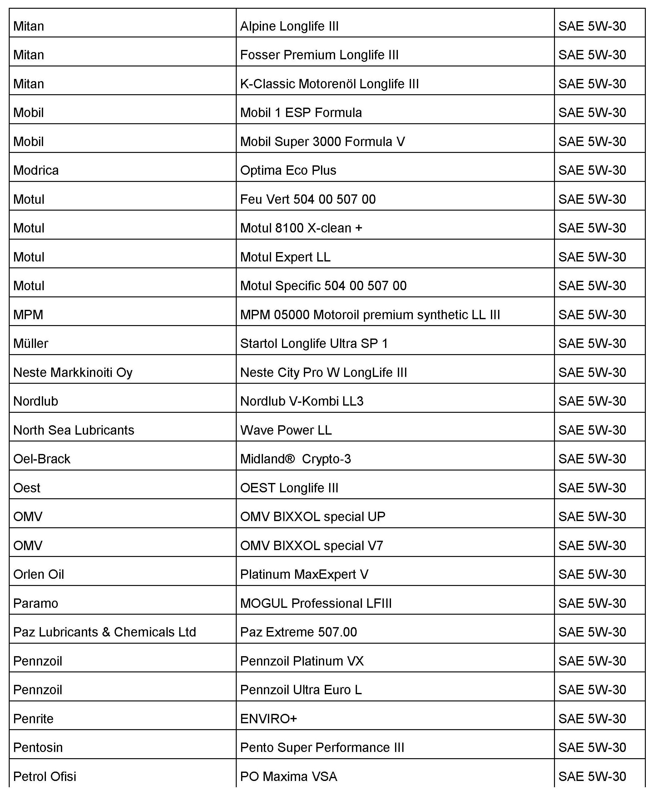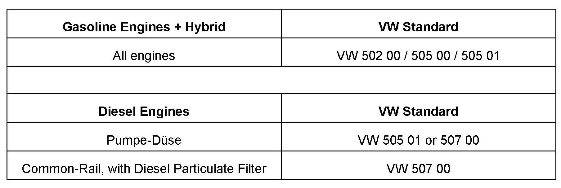 SOME ENGINE OILS LISTED ON THE ATTACHMENT MAY NOT BE AVAILABLE IN NORTH AMERICA. Please refer to the specific Vehicle Owners Manual, published Technical Bulletins and Fluid Capacity Charts to select the appropriate oil required for each Volkswagen vehicle.