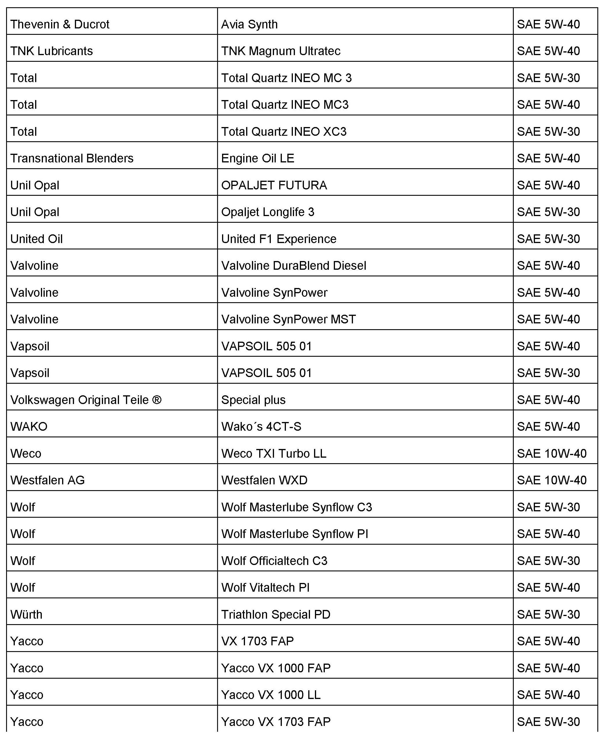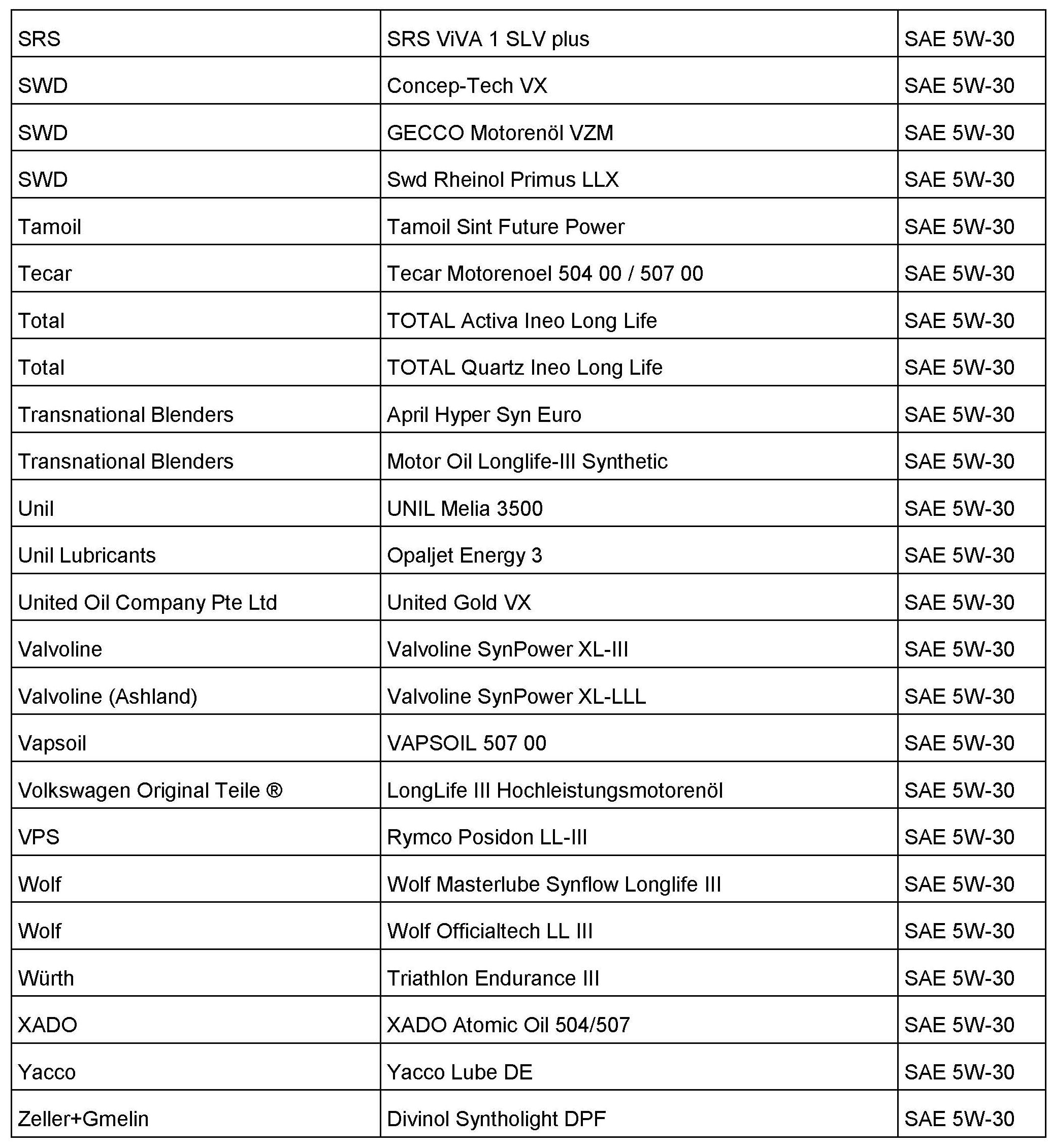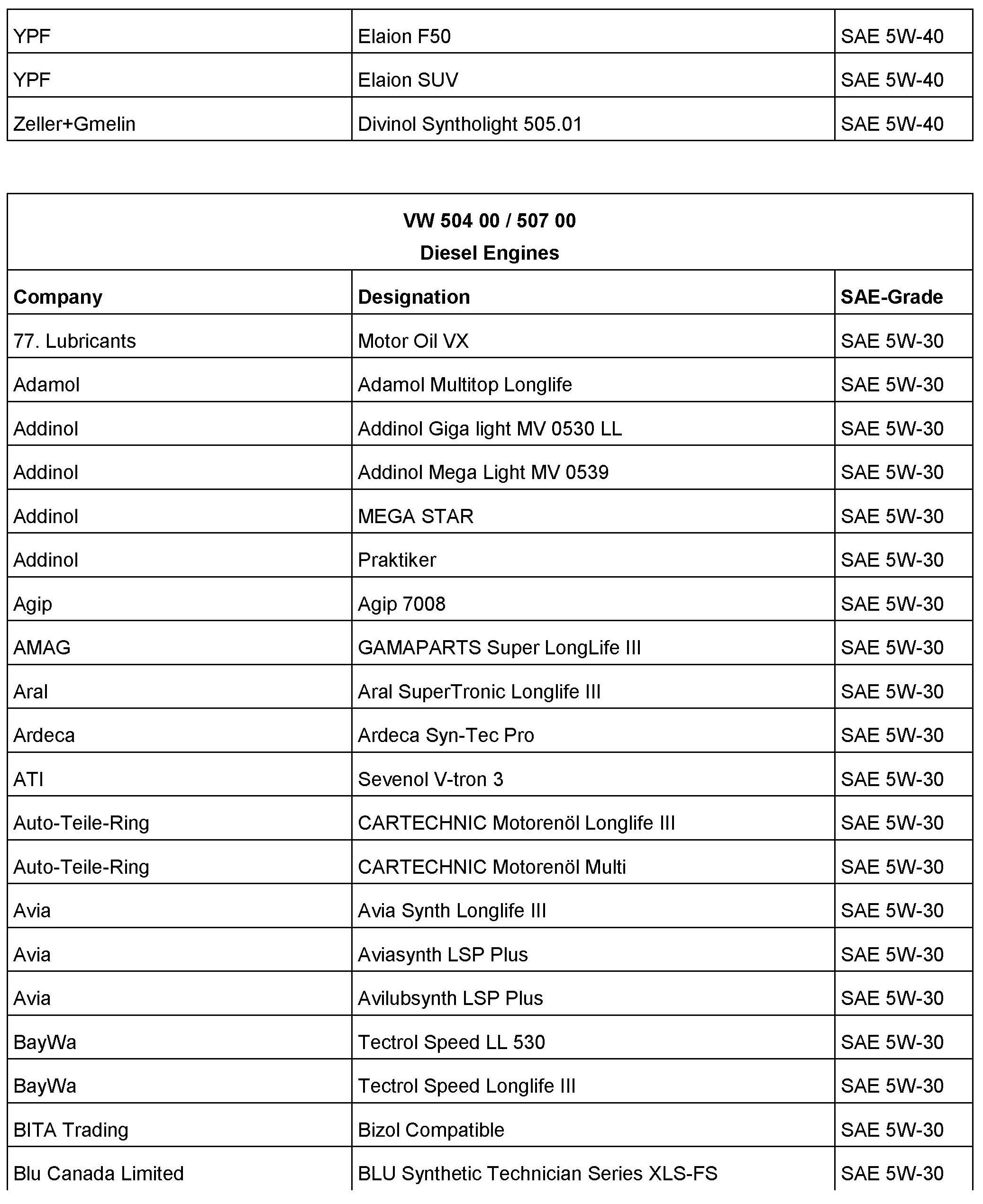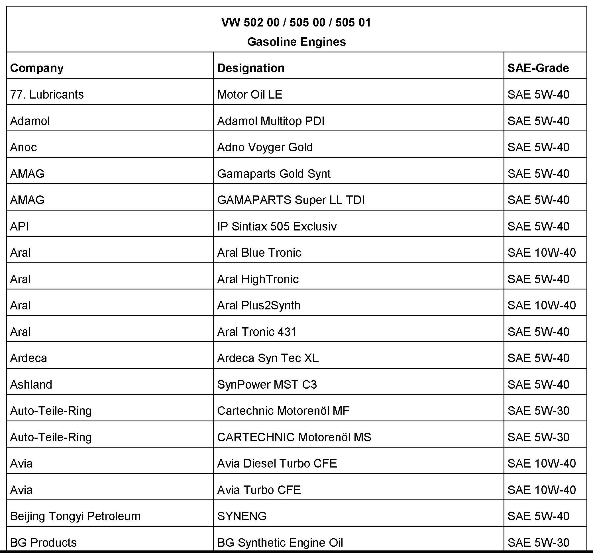 Attached is a "Worldwide" list of engine oils which currently meet Volkswagen Oil Quality Standard VW 502 00/505