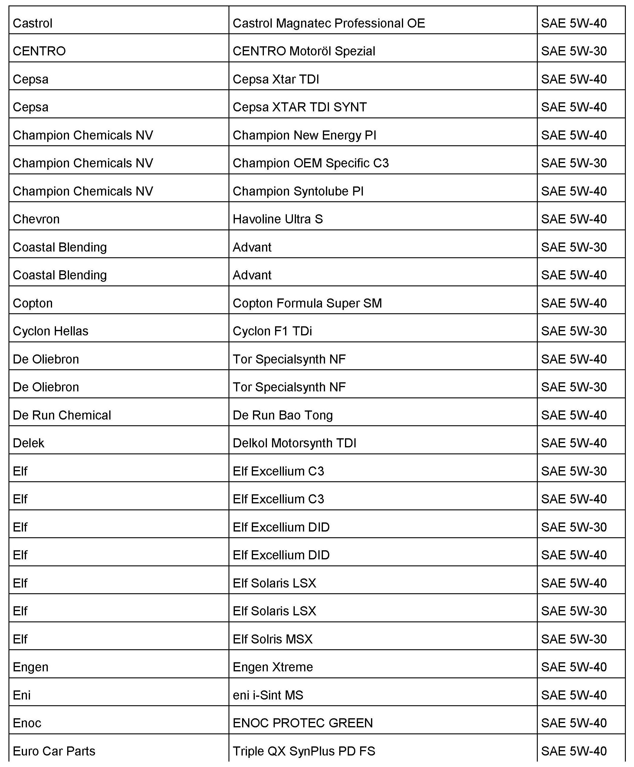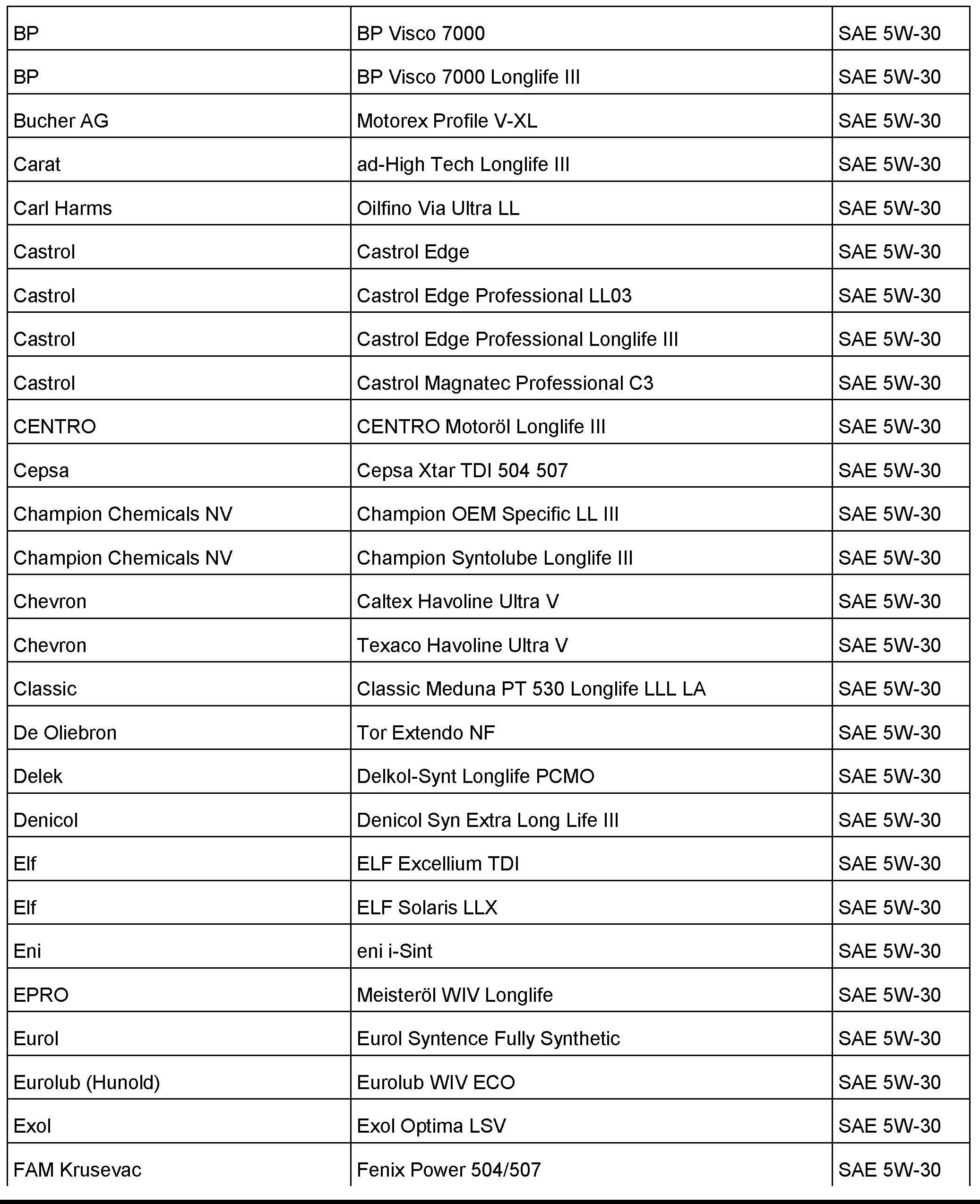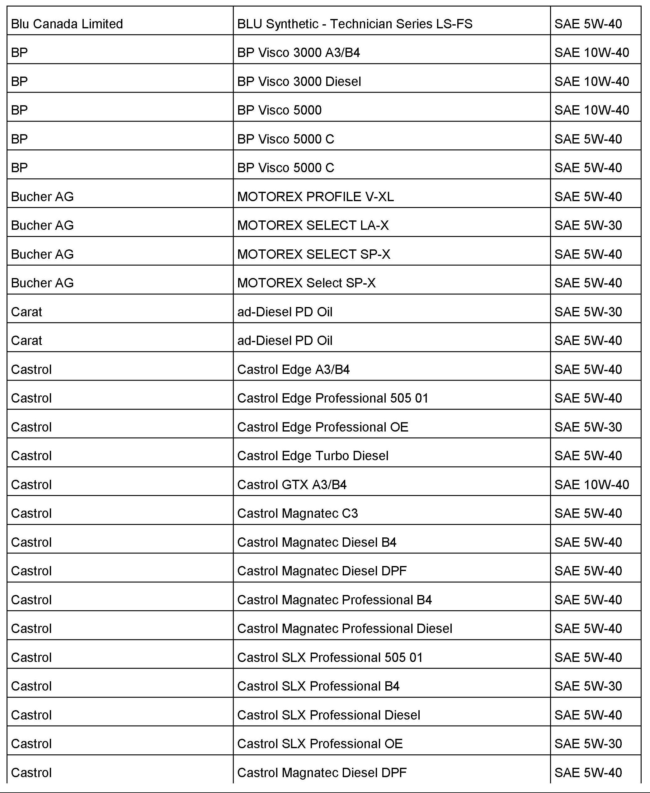 The sample list shown are products generally available in the North American market that meet the Volkswagen Oil Quality Standard VW 502 00/505 00/505 01 and VW 504 00/507 00 specification at the time