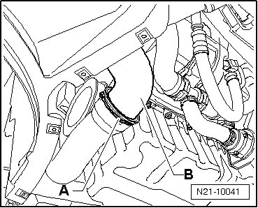 - Release the clip - A - and disconnect the charge air hose - B - from the charge air pipe.