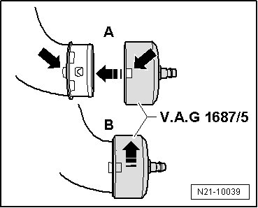 • Before removing the end seal, discharge the pressure in the testing circuit by pulling off the coupling from the end seal (V.A.G 1687/5).