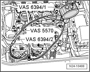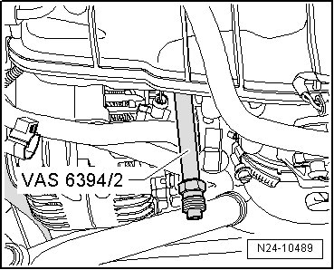 - Coat the adapter (VAS 6394/2) sealing point with clean engine oil and install it in the fuel rail. Tightening specification: 27 Nm.