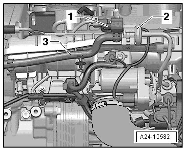 - Remove the connector - 1 - and the ventilation hose - 3 - from the EVAP canister purge regulator valve 1 - 2 -.
