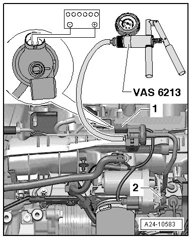 - Connect the contacts on the solenoid valve - 1 - with the battery using adapter lines. This opens the EVAP canister purge regulator valve 1.