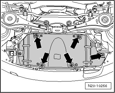 - Lower the rear subframe slowly using the engine-/gearbox jack (V.A.G 1383 A) approximately 20 mm.