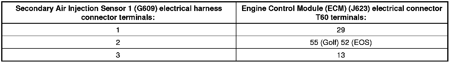 - Using a multimeter, check the Secondary Air Injection Sensor 1 (G609) electrical harness connector terminals to the Engine Control Module (ECM) (J623) electrical harness connector T60 terminals for an open circuit according to the wiring diagram.