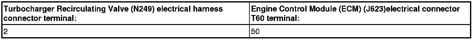 - Using a multimeter, check the Turbocharger Recirculating Valve (N249) electrical harness connector terminal to Motronic Engine Control Module (ECM) (J623)electrical harness connector T60 for an open circuit.