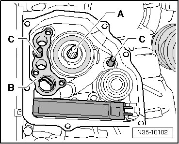 - Insert the oil pump input shaft - A - all the way into the transmission. Turn the input shaft while doing this.