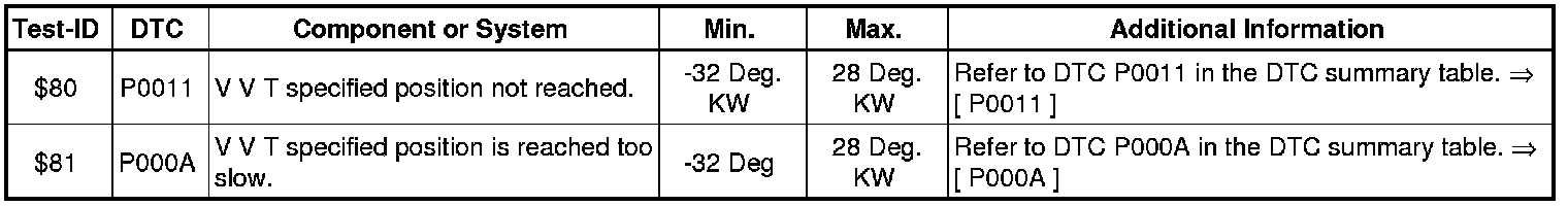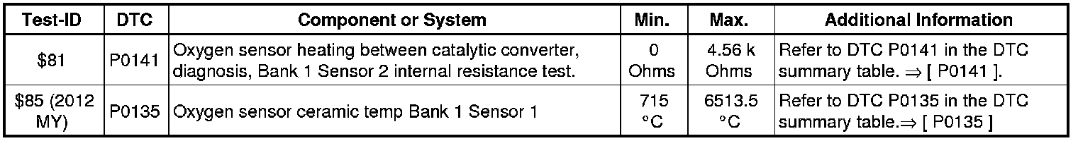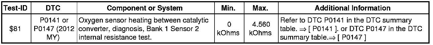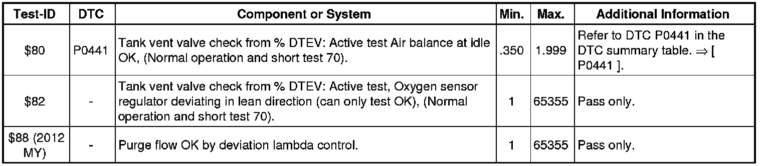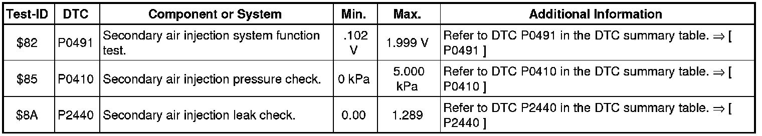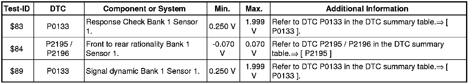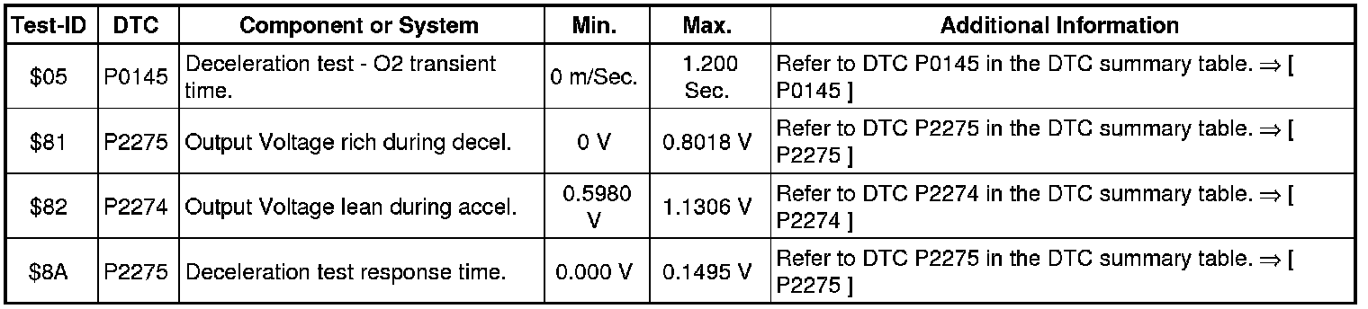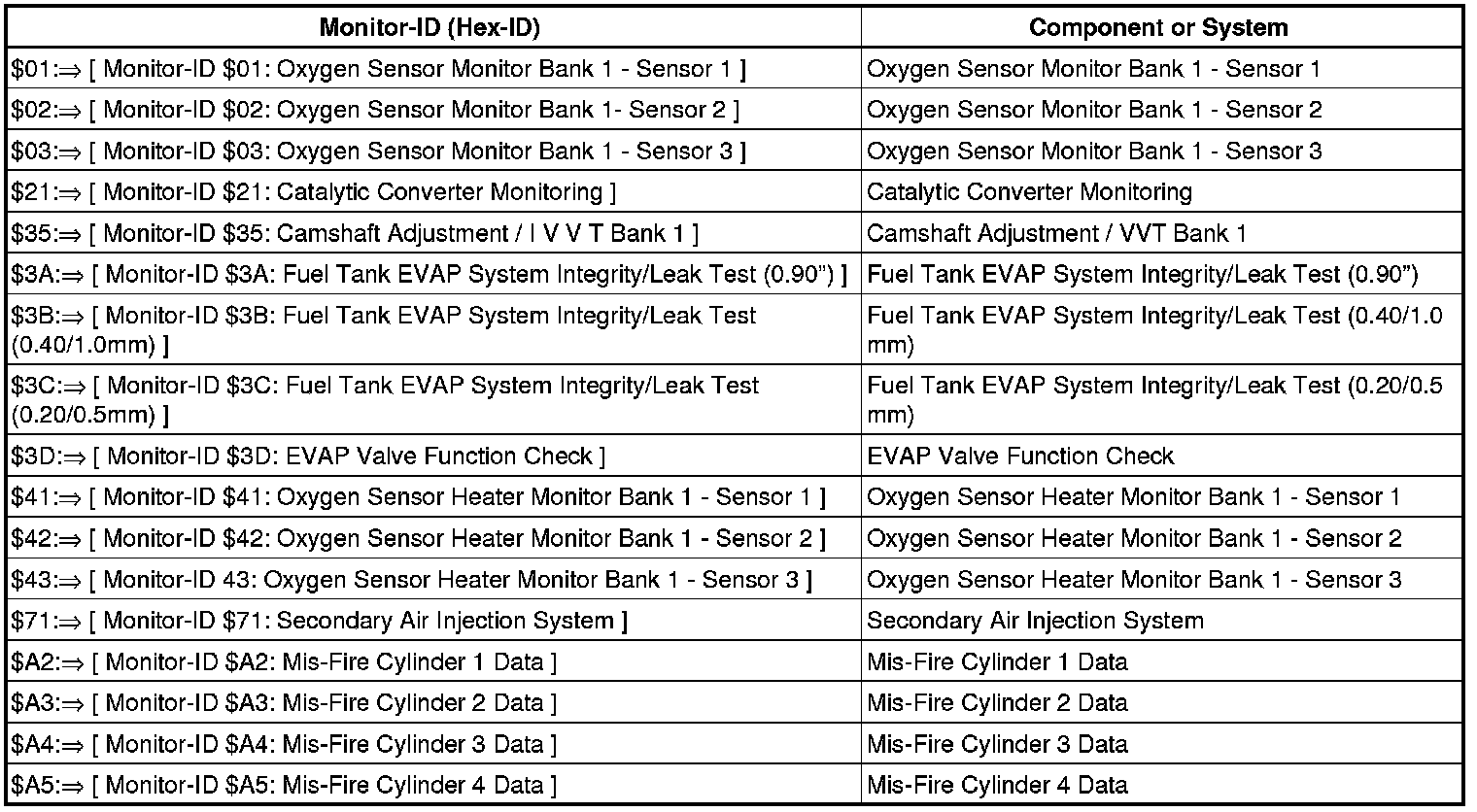 - If any of components or systems fail to meet the specified values. Refer to Diagnostic "Mode 03: Interrogating Fault Memory" to check for stored DTC's or the corresponding diagnostic repair procedure => [ Diagnostic Mode 03 - Read DTC Memory ] Diagnostic Mode 03 - Read DTC Memory. Diagnostic Mode 03 - Read DTC Memory.