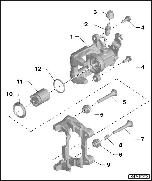 • Removing and installing, refer to => [ Rear Brake Caliper Piston, Bosch ] Rear Brake Caliper Piston, Bosch.