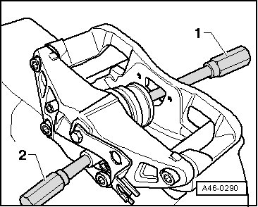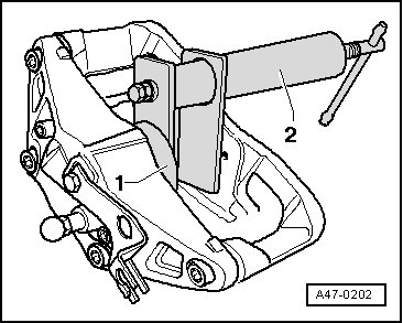 - Press in the protective cap with the disk - 1 - and the piston resetting tool (T10145) - 2 - into the brake caliper so that it contacts the brake caliper completely.