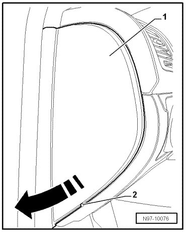 - Remove side cover - 1 - of instrument panel, do this by inserting (VAS 3409) or a screwdriver into recess - 2 - and pry off cover - 1 - in - direction of arrow -.
